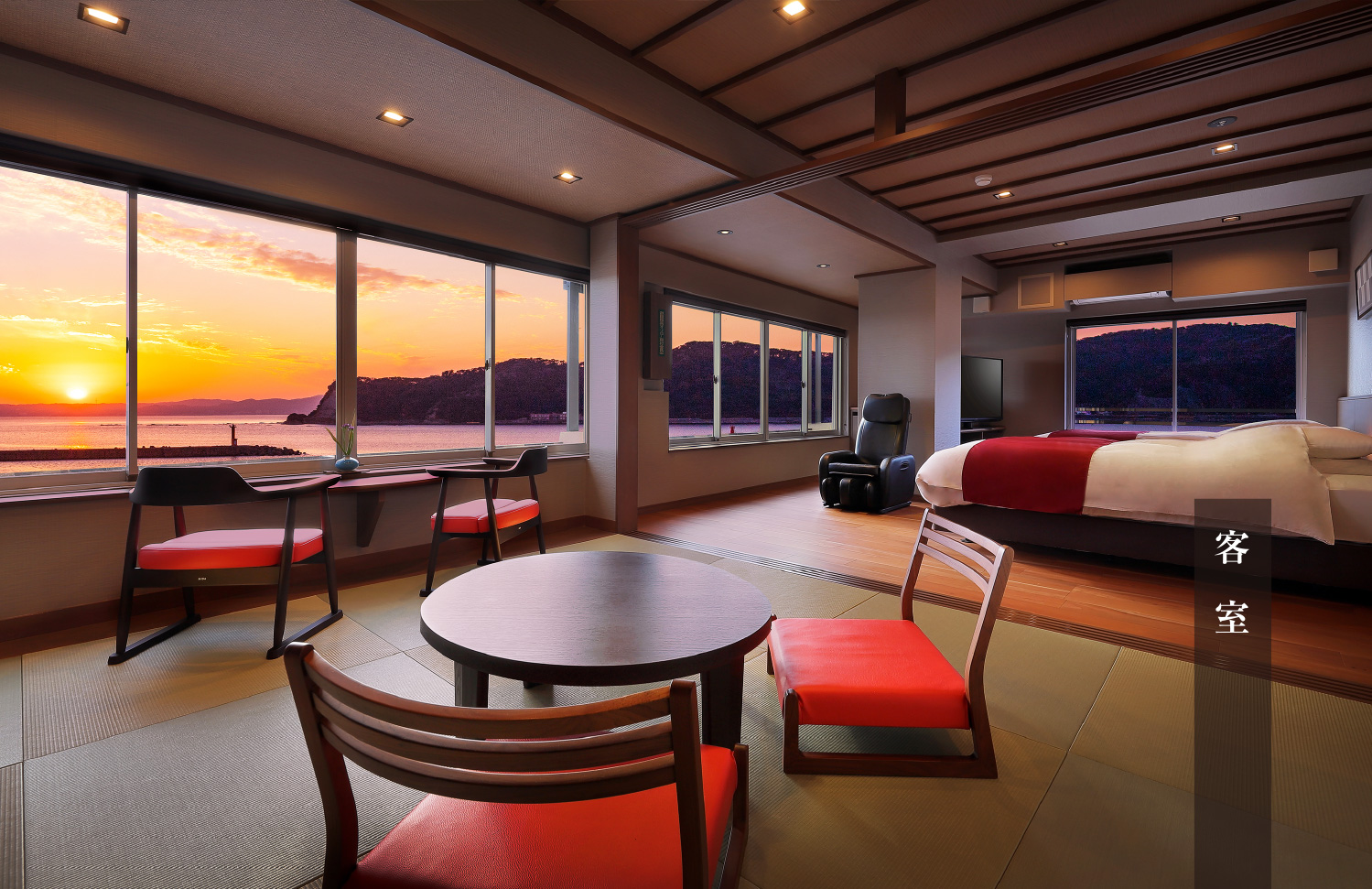 まるで絵画のような夕陽を眺めながら、ゆったりとした時をお過ごしください。 お部屋は趣きの違う4タイプ(全6室)をご用意しております。 海の庭は大人が寛げる宿の為、12歳以下のご宿泊はご遠慮させていただいております。